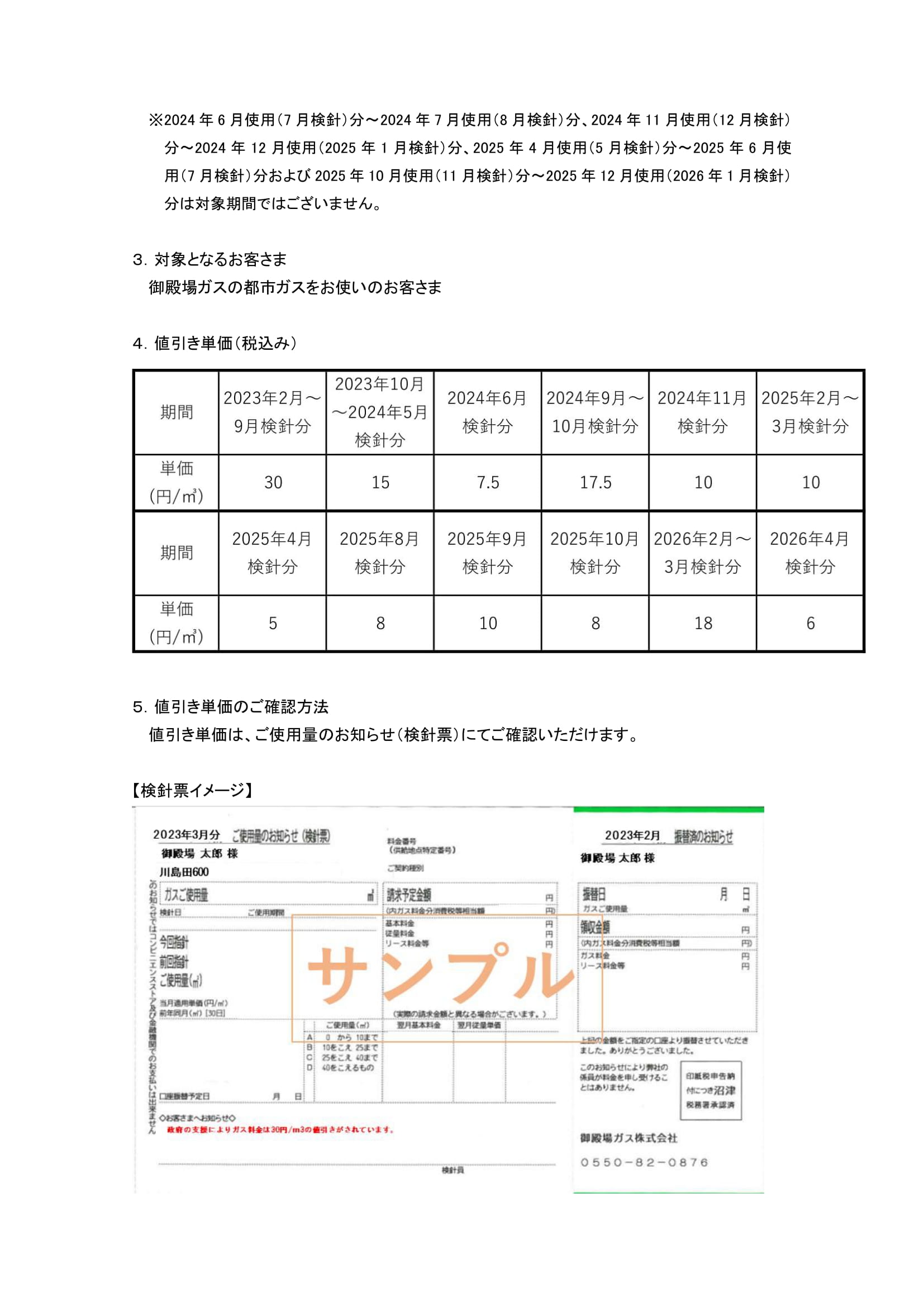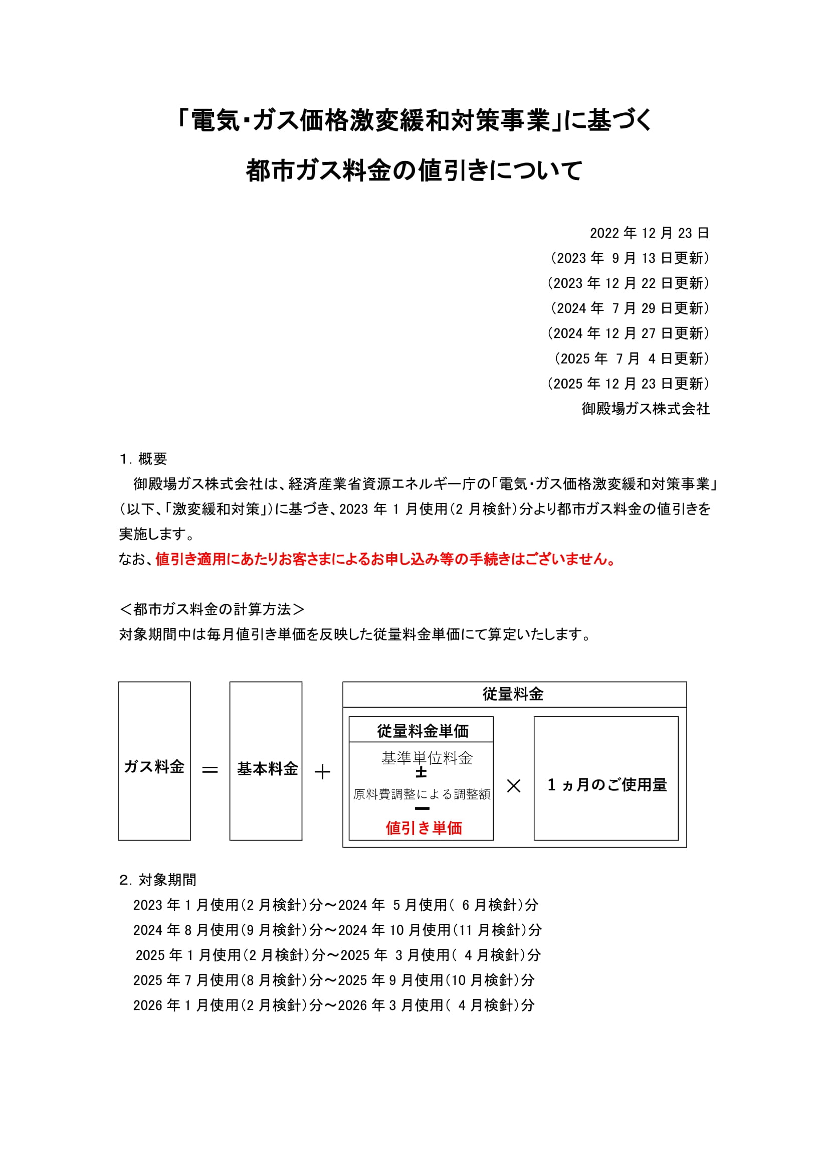 23Dec「電気・ガス価格激変緩和対策事業」に基づく 都市ガス料金の値引きについて御殿場ガス株式会社は、経済産業省資源エネルギー庁の「電気・ガス価格激変緩和対策事業」(以下、「激変緩和対策」)に基づき、2023年1月使用(2月検針)分より都市ガス料金の値引きを実施します。 なお、値引き適用にあたりお客さまによるお申し込み等の手続きはございません。 下記画像をクリックするとPDFで表示されます。 “>